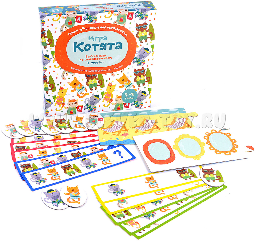 2. Игра для поля с шезлонгами (обратная сторона игрового поля). Начинайте с заданий в зеленой рамке: воспроизводите заданную карточкой последовательность котят. Более сложные задания предлагают не только продолжить ряд, но и установить взаимосвязь и закончить последовательность самостоятельно. К этим заданиям стоит переходить, когда малыш уверенно справляется с зелеными карточками.