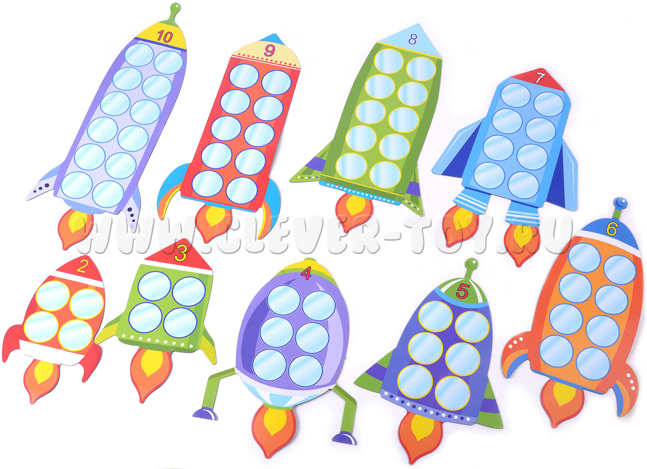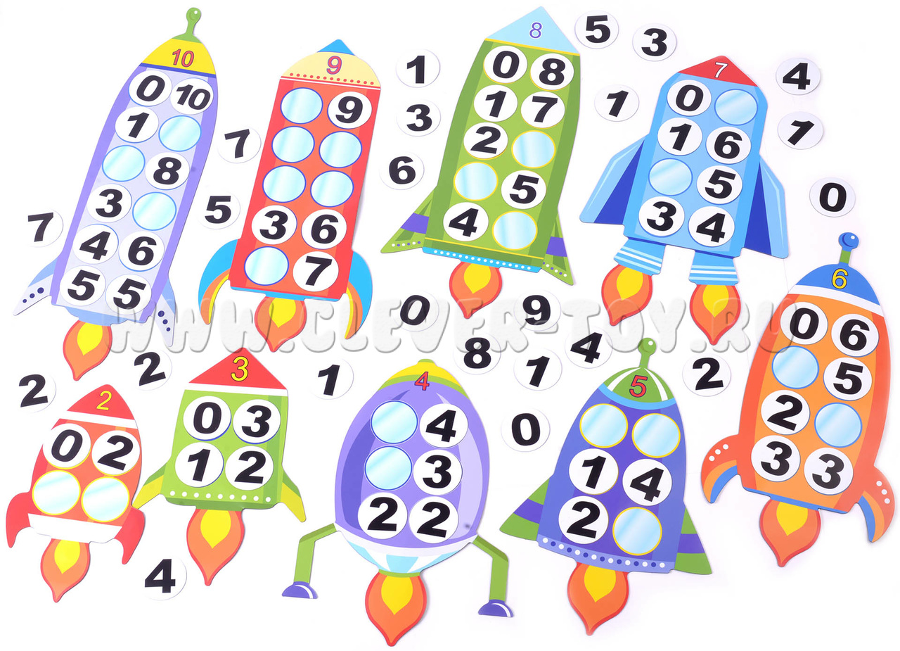 Магнитные поля-ракеты надёжно притягиваются к школьной магнитной доске, а на их лицевой поверхности будут хорошо держаться магнитные карточки с цифрами.