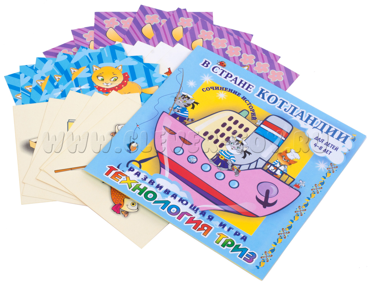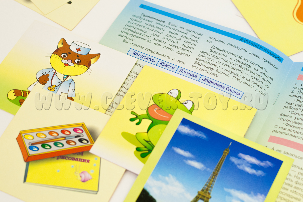 • подробная инструкция, в которой описан механизм игры, приведены примеры историй и познавательные факты о странах и городах, о роли котов в истории, об их кличках.