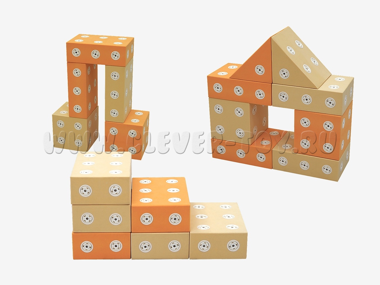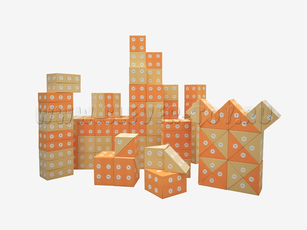 Напольный конструктор выполнен в двух цветах.Крупные детали в виде геометрических фигур выполнены из мягкого гипоаллергенного материала. Крепления имеет магнитную систему для быстрой и простой стыковки-расстыковки деталей. У каждой детали есть от 14 до 24 вариантов магнитной стыковки, что дает полную свободу для творчества.