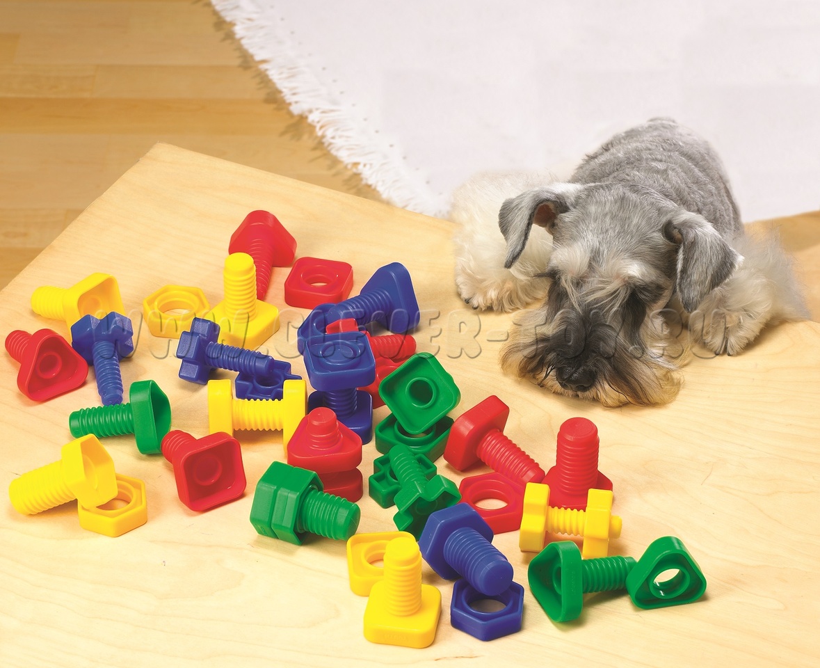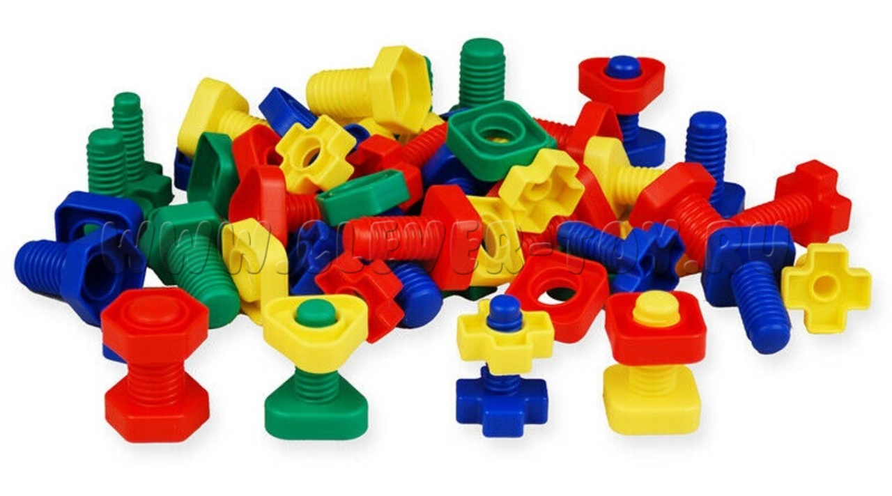 Простые в использовании крупные гайки и болтики (длина болтика 6 см). Шляпка болтика и гаечка выполнены в 4-х разных геометрических формах и в 6 ярких цветах.