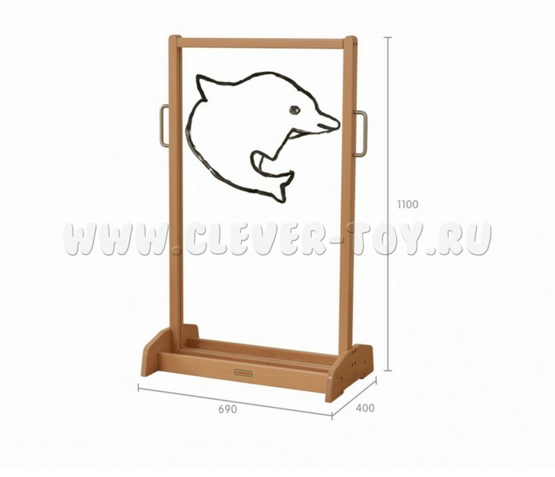 Двусторонний напольный мольберт для создания творческих работ с использованием красок или маркеров на водной основе. Рамка и основание выполнены из массива бука (который долго прослужит), поверхность для рисования - из акрилового стекла. В основании с двух сторон имеются выемки для стаканов, красок и кисточек. По бокам имеются удобные металлически ручки для переноски, что позволяет размещать мольберт в любом месте.