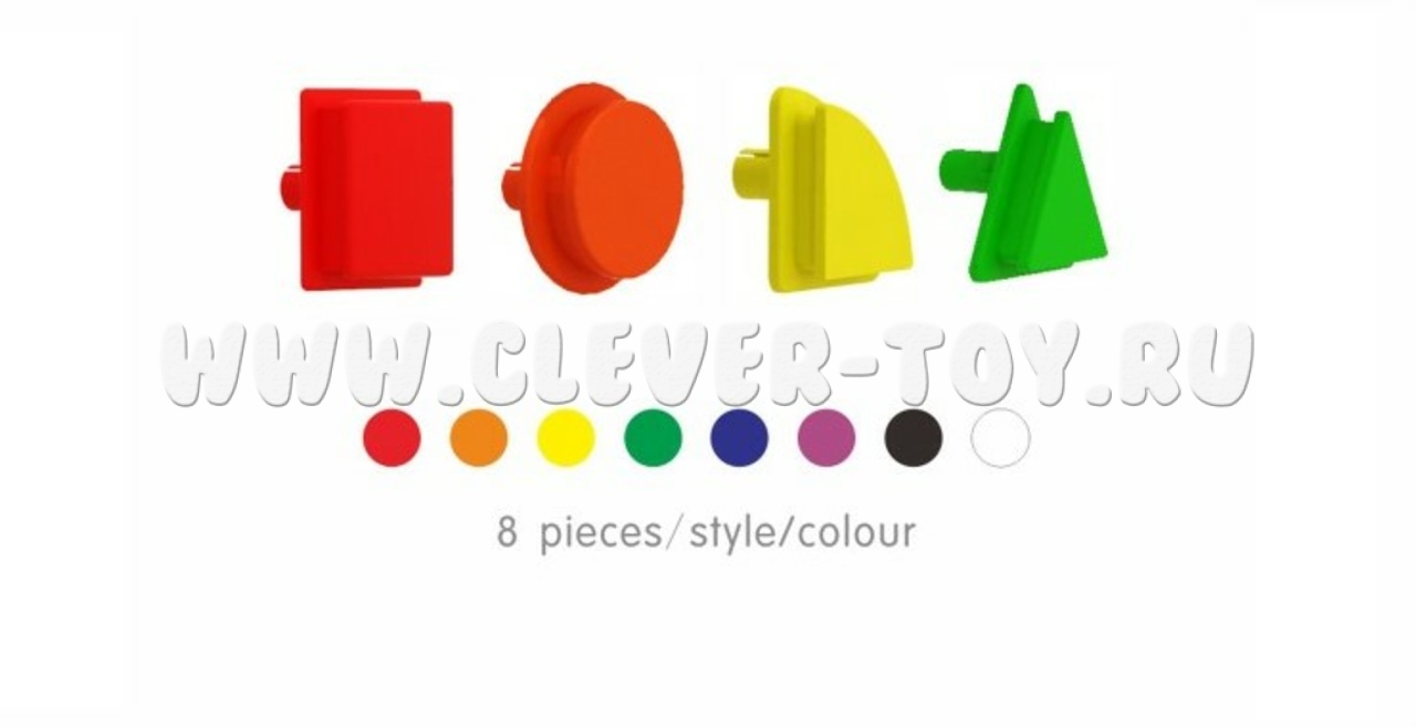 Набор состоит из 256 разноцветных колышек в 8 цветах (красный, оранжевый, черный, желтый, синий, зеленый, фиолетовый, белый) в 4-х геометрических формах (круг, квадрат, треугольник, квадрант).
