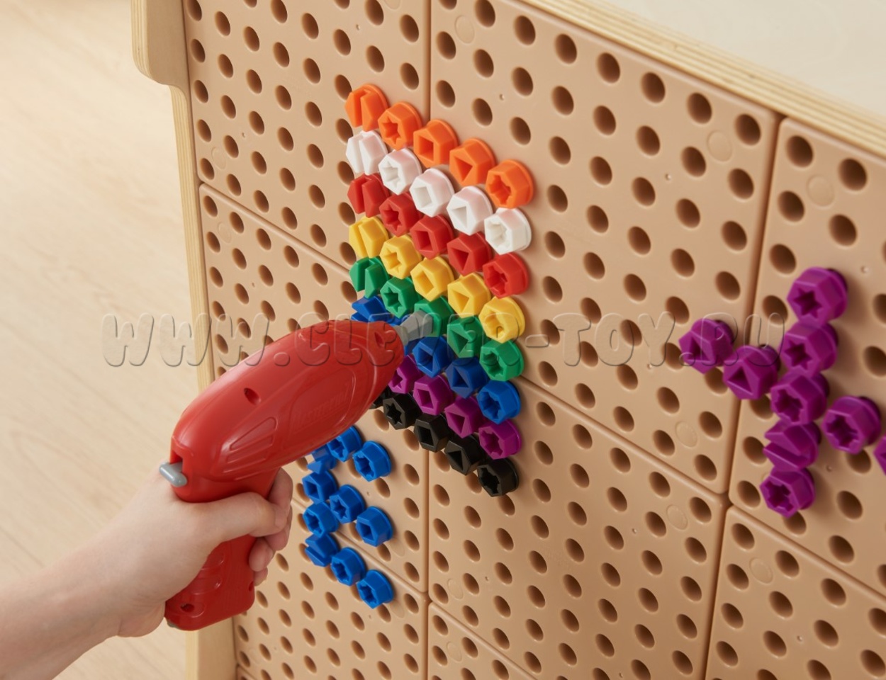 Набор состоит из 512 разноцветных винтов в 8 цветах (красный, оранжевый, черный, желтый, синий, зеленый, фиолетовый, белый), имеющих на шляпке шлицы 5 разных геометрических форм.
